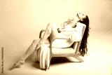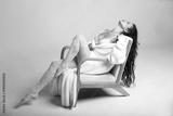 Cozy photoshoot studio woman portrait of sensual brunette model in white coat with lace stocking lying on modern armchair isolated on grey background.