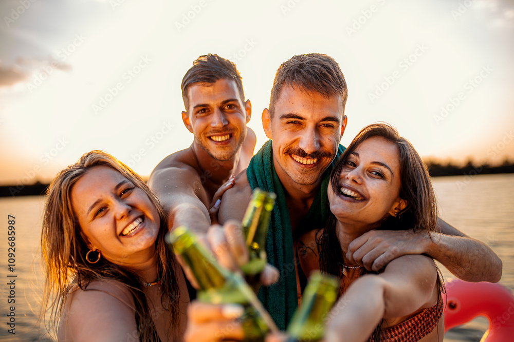 Portrait of group of friends in swimsuit having fun standing on a pier drinking beer enjoying a summer day at the lake.