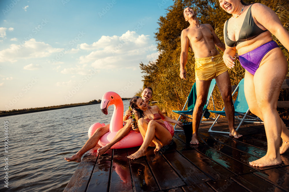 Group of friends having fun enjoying a summer day jumping at the lake.