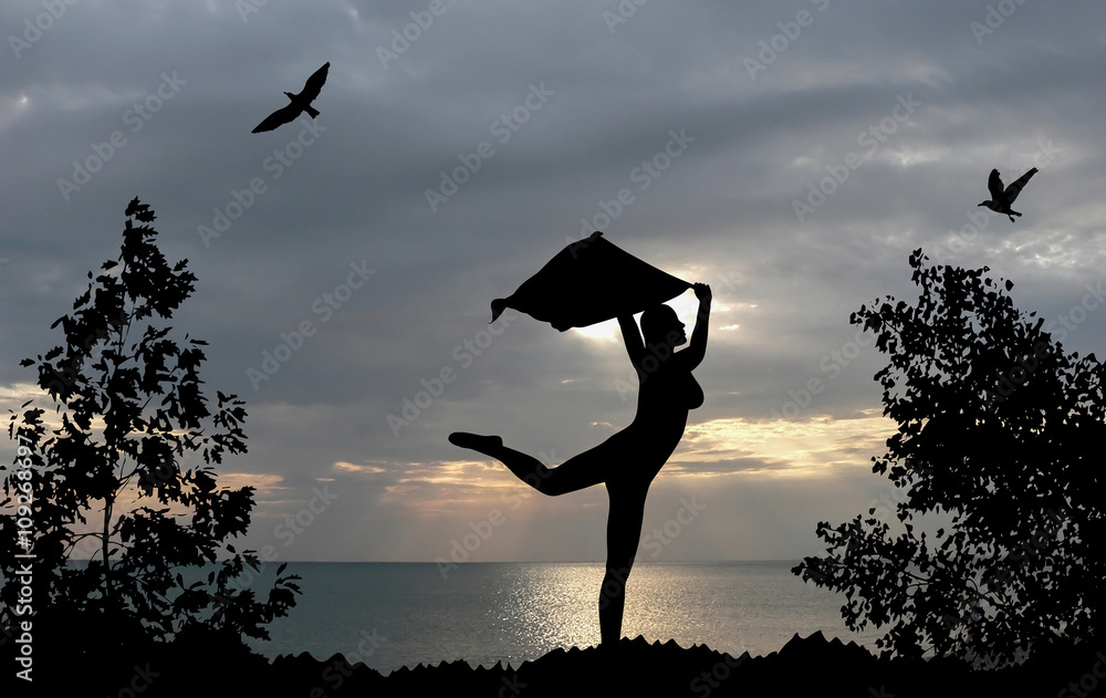 Young girl silhouette with shawl dancing on sea sunset with grey cloudy sky background