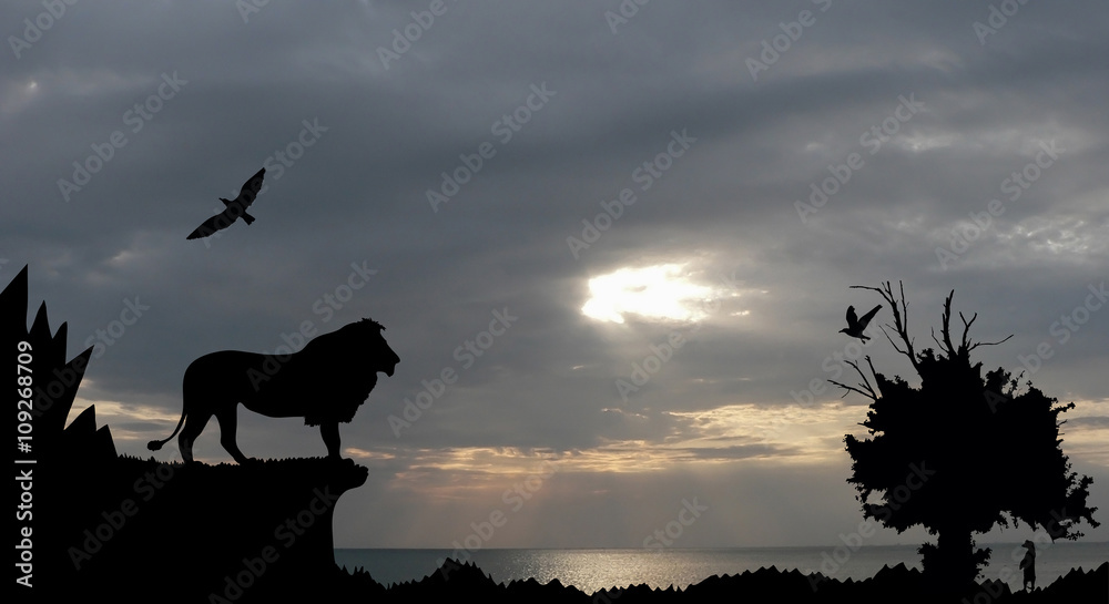 Jungle with mountains, old tree, birds lion and meerkat on sea sunset with grey cloudy sky background