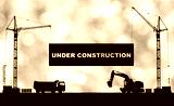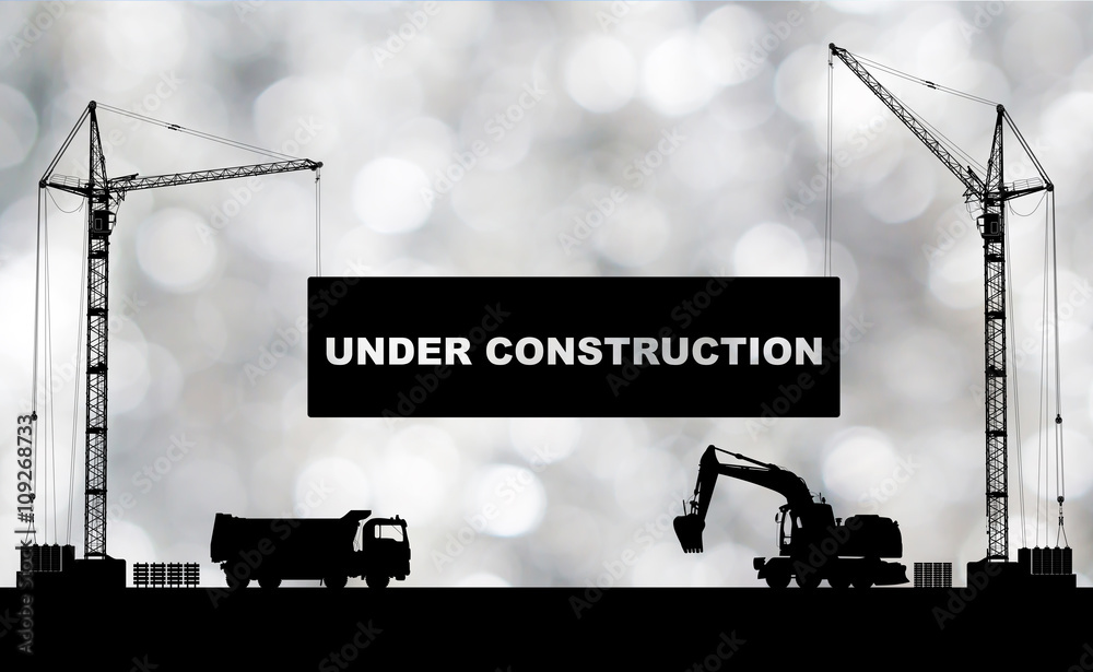 "Under construction" concept at building site with detailed silhouettes of construction machines on blured silver shiny background