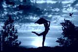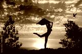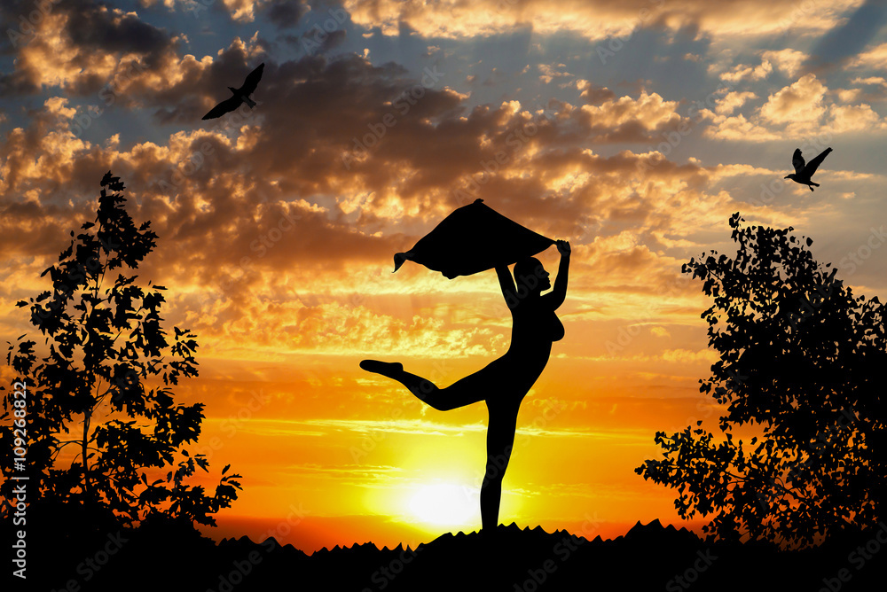 Young girl silhouette with shawl dancing on golden cloudy sunset background