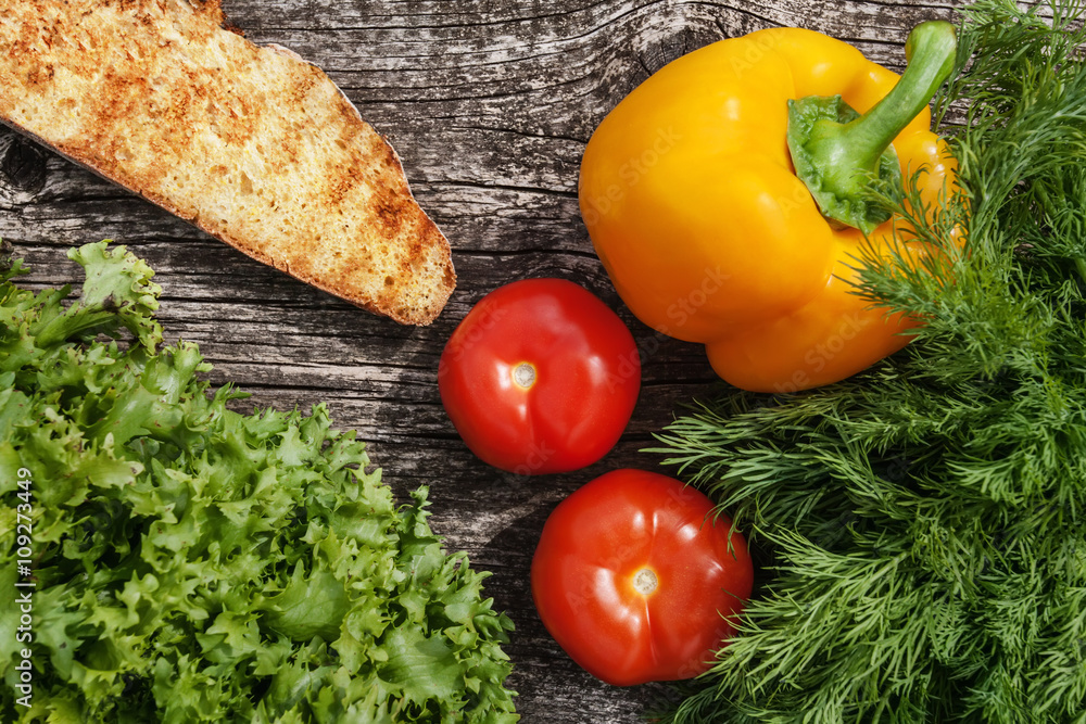 Flat lay of fresh vegetables and fried bread on the old vintage wooden table. Ingredients for salad. Close up. Top view