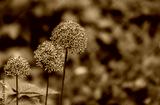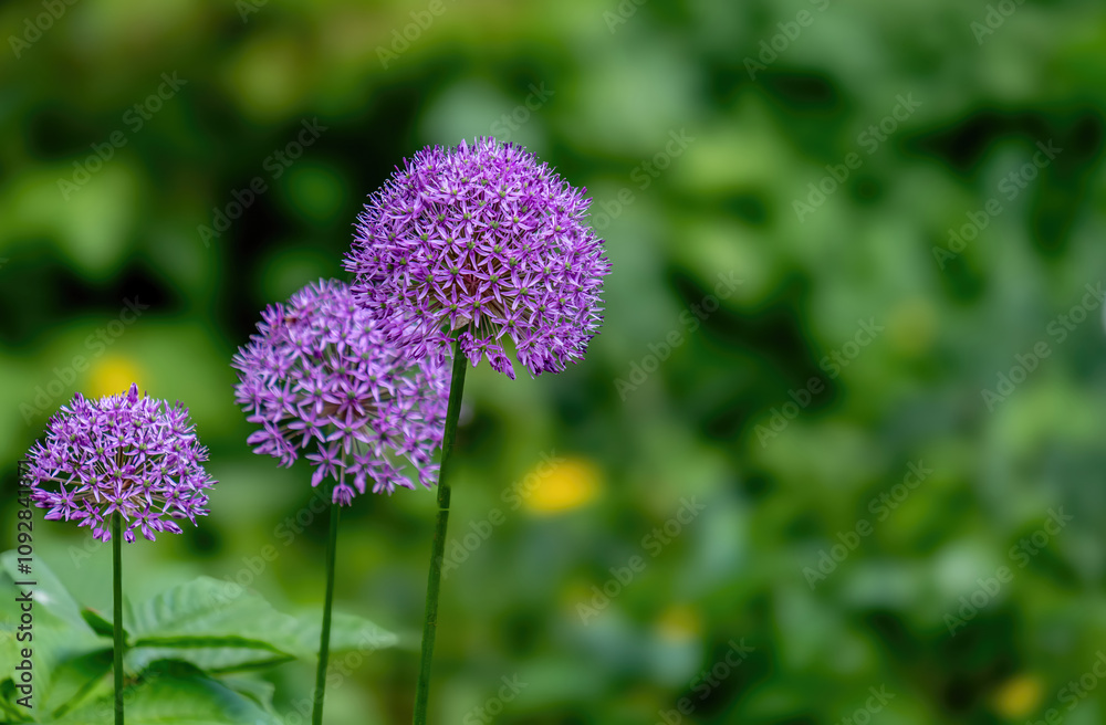 Heads of blooming wild onions in the garden close-up.