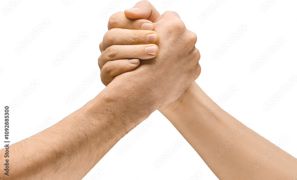 Two hands gripping each other in a wrestling motion, symbolizing strength, challenge, support, assistance and friendship. Isolated on transparent background Concept of visual communication, signs
