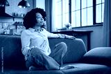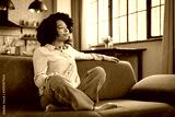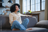 Young calm black woman relaxing sit on comfortable sofa in modern living room, lazy happy african lady resting on couch breathing fresh air enjoy peace of mind no stress free on couch at home