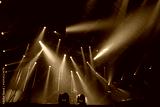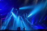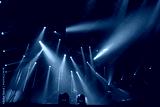 Concert hall with bright spotlights. Lighting equipment around stage. Empty hall for concert or disco. Spotlight beams among blue neon light. Powerful spotlights illuminate nightclub stage