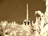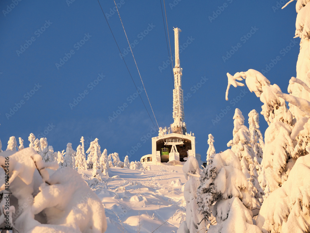 Cable car station and track in winter in the mountains