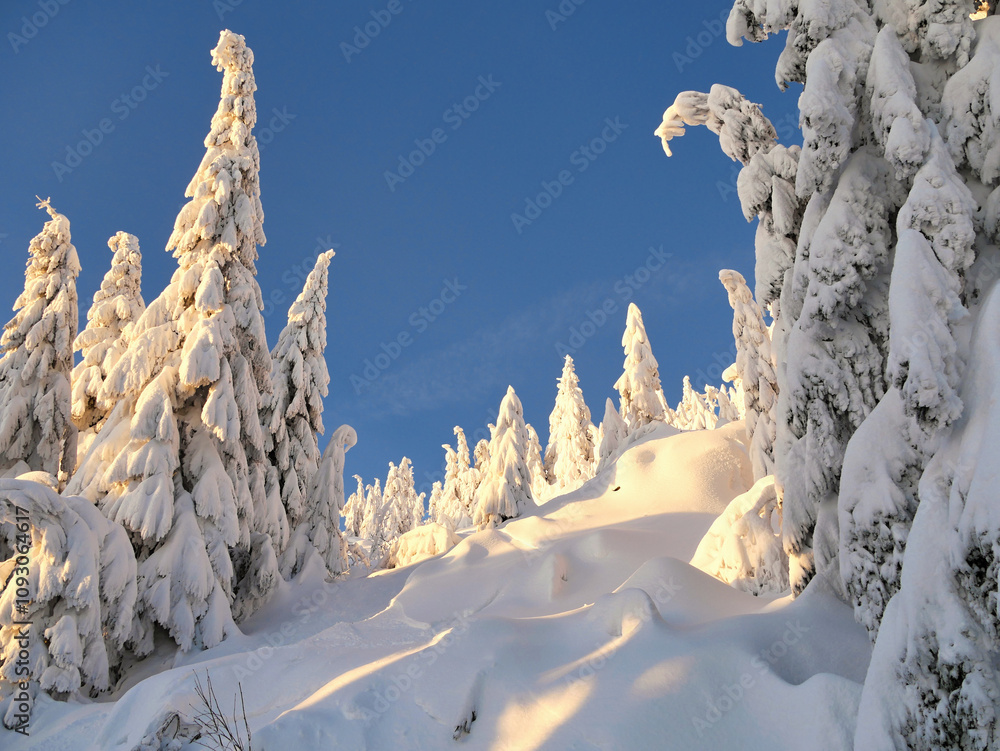 Snow-covered trees in winter landscape with blue sky, abstract nature