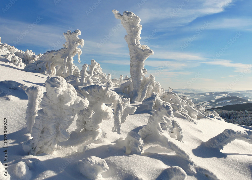Snow-covered trees in a winter landscape with blue sky and beautiful light, abstract fairy tale nature