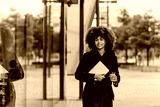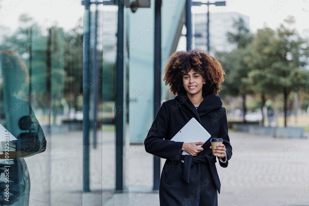 young African American business woman using digital tablet in city of Spain Europe, financial and caribbean people with skyscraper background