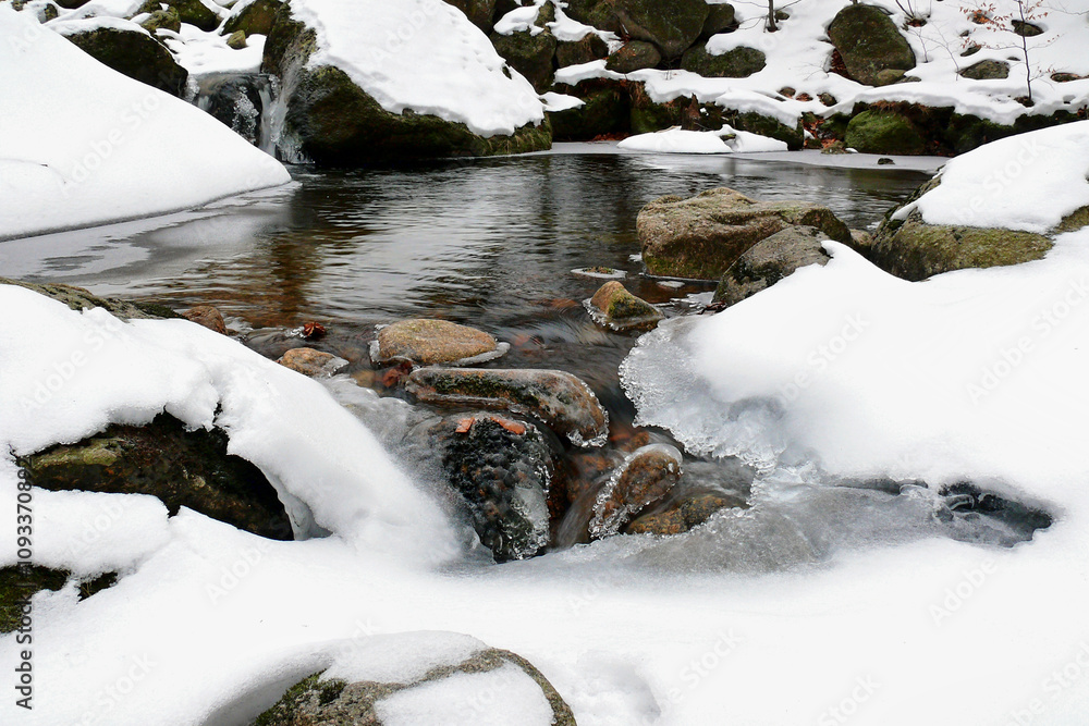 Icicles and rapids of a mountain stream, the magic of winter