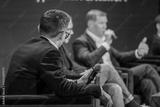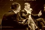 Corporate leaders engaging in discussion on stage with microphones and audience. Professional conversation during formal event.