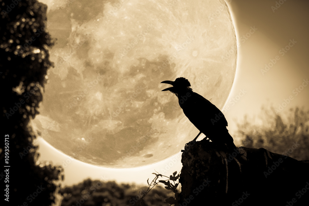 Night sky with full moon, tree and silhouette of crow that can be used for halloween.