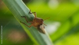 photo of grasshopper perched on sugar cane leaf