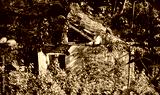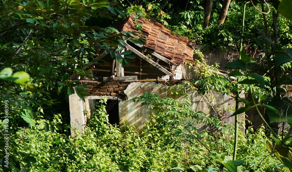 old building covered in bushes, looks old and ruined
