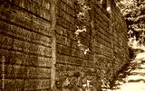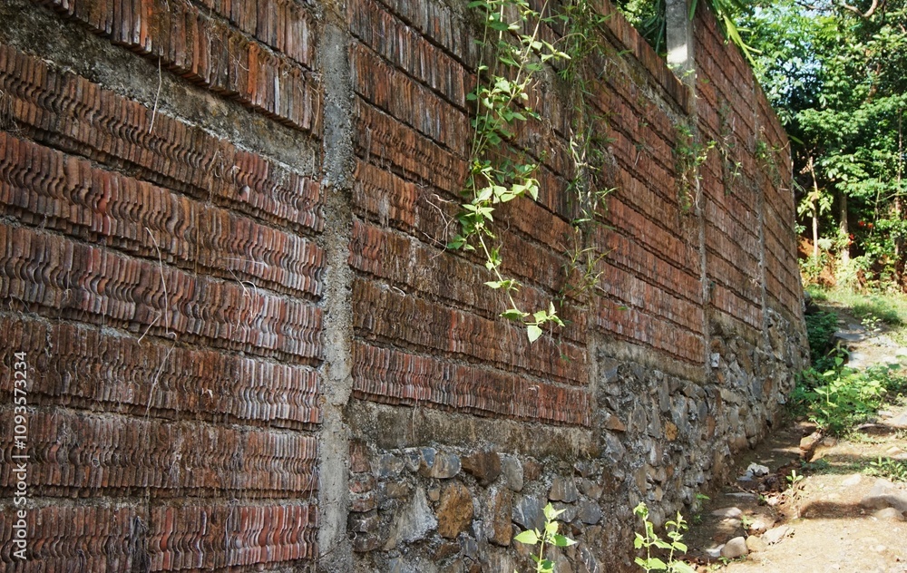 photo of a tall, sturdy fence made of neatly arranged roof tiles and given cement for reinforcement
