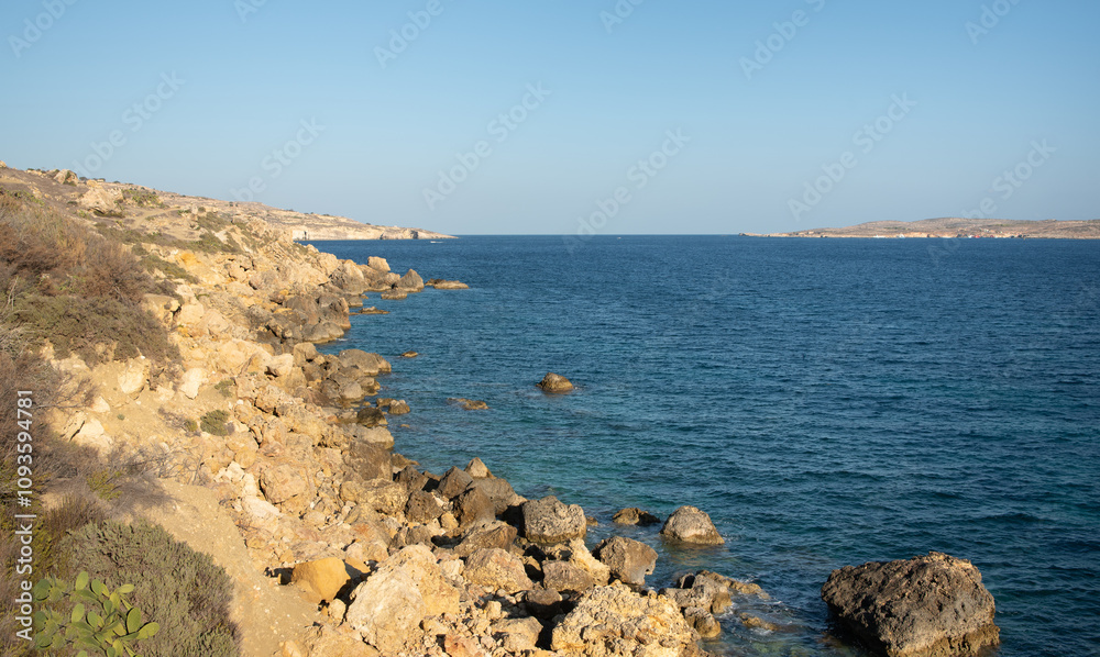 View over a rocky coastline towards the sea. An island and the blue sky in the background.