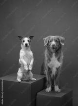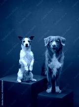 A Jack Russell Terrier and a Nova Scotia Duck Tolling Retriever dogs sit on blue boxes, posing against a matching blue background