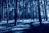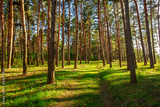 Marvelous pine forest with a path overgrown with green grass shining in the sun.