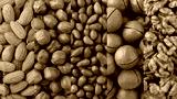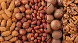 Top view of many different nuts close up. Hazelnuts, almonds, peanuts, walnuts and macadamia