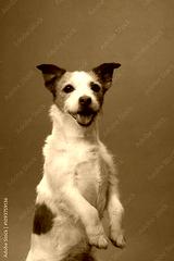 A Jack Russell Terrier sits upright on its hind legs against a blue background, looking playful and alert. The dog expression and posture highlight its energetic in a studio setting.
