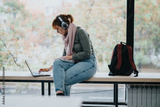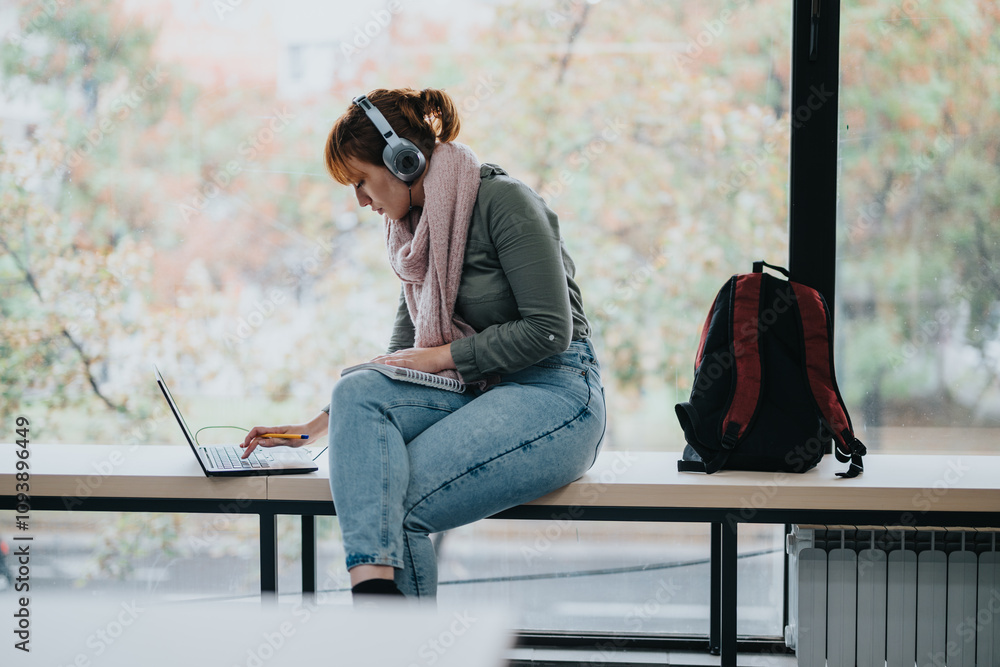 A young female student wearing headphones sits by a window while studying with her laptop and notebook. She appears focused and engaged in a modern library setting.