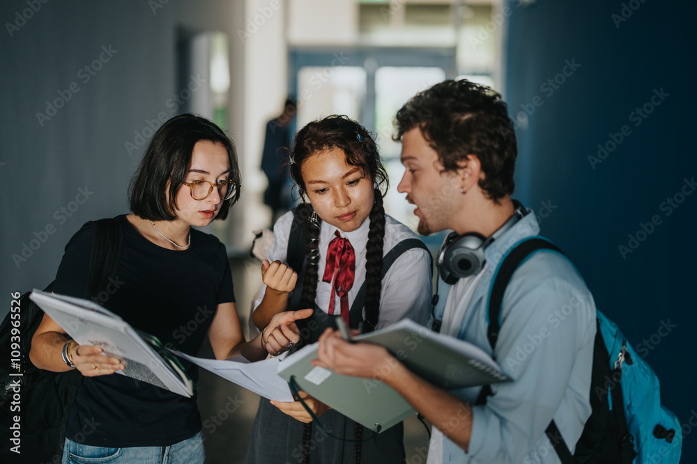 Three diverse students engage in an animated discussion, holding notebooks and textbooks, while standing in a busy school hallway. The scene captures academic collaboration and lively student