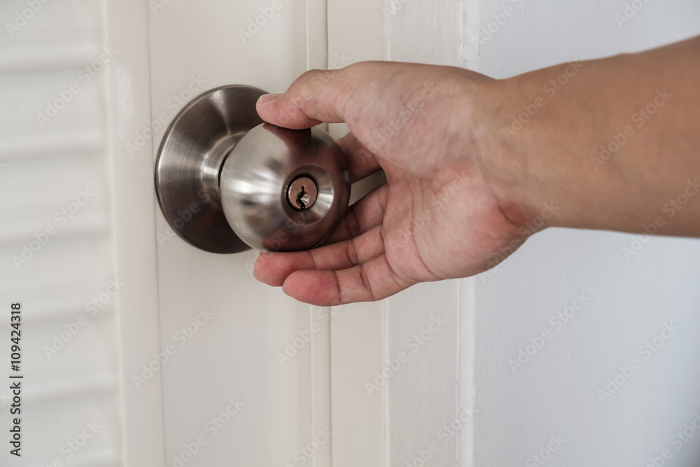Close-up hand holding door knob, selective focus on knob