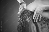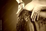Beautiful belly dancer young woman in gorgeous red and green costume dress. Part of body