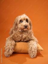 A Labradoodle with curly fur rests its head on a pillow, set against an orange background.