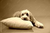 A Labradoodle with curly fur lays comfortably on a pillow, looking content against an orange background.