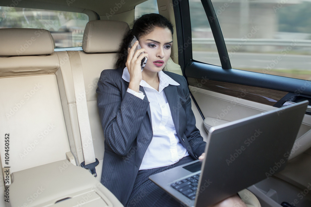 Busy Indian businesswoman working in car