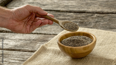 Male hand holding wooden spoon full of nutritional Chia seeds