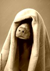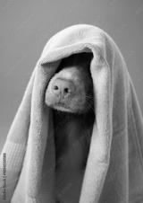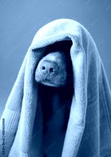 A Nova Scotia Duck Tolling Retriever sits wrapped in a towel against an orange background, with a soft and gentle expression. The scene conveys warmth and coziness post-bath.
