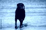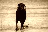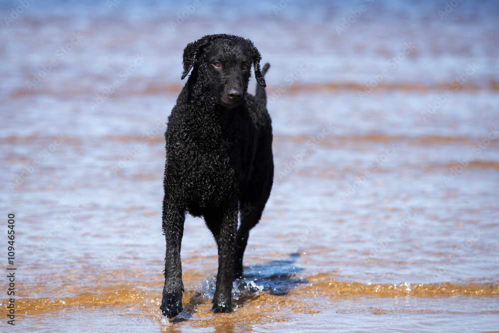 black curly coated retriever dog on the beach