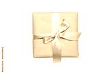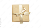 Gift box wrapped in craft paper with a gold bow on a white background.