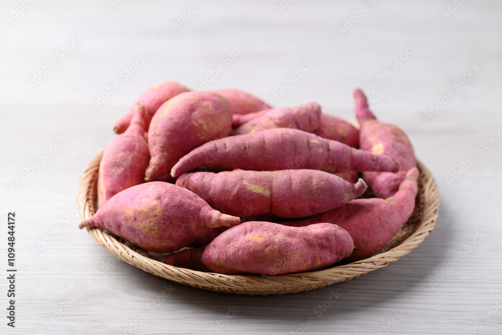 Organic raw sweet potatoes from local farmer market in basket on white table