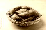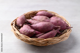 Organic raw purple sweet potatoes from local farmer market in basket on white table