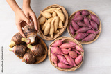 Organic raw sweet potatoes and taro with hand on white background, Table top view