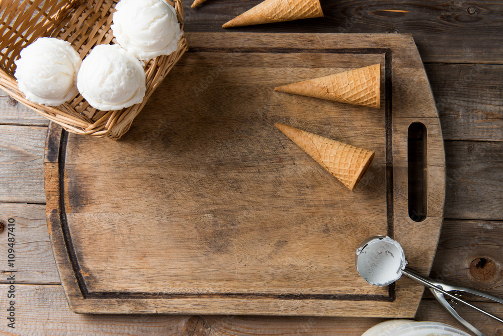 creamy vanilla ice cream in preparation with rustic background
