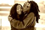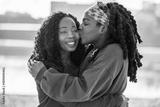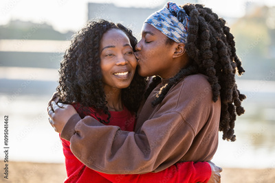 Portrait of two women smiling and embracing each other at city beach