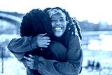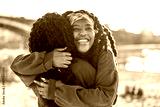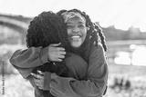 Portrait of two women smiling and embracing each other at city beach
