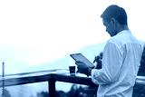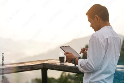 Man in white shirt using tablet in the morning with beautiful sunset and mountain in background.Concepts of relaxation, nature travel and technology