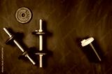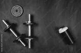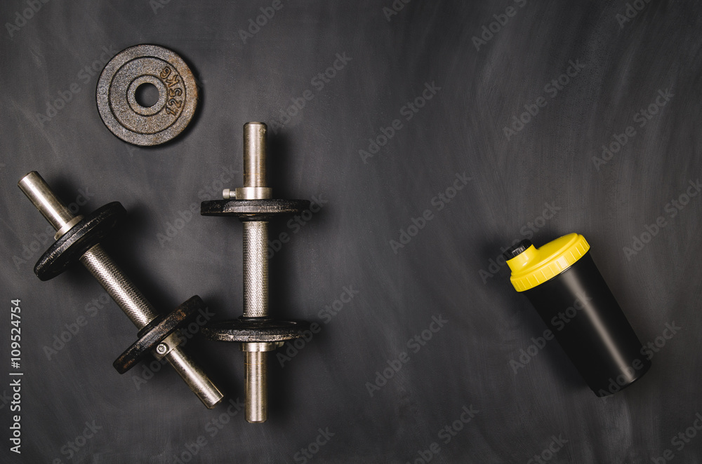 Iron dumbbells on a black chalkboard seen from above. Photo taken from above, top view. Conceptual image background for sport or fitness advertising. Horizontal image.