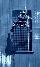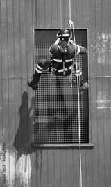 brave firefighter in uniform and harness scaling building facade with ropes and carabiners