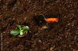 Planting a beautiful, green leaved plant on a natural, sandy soil backgroud. Camera from above, top view. Natural background for advertisements.
