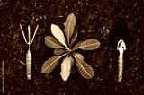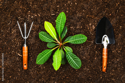 Planting a beautiful, green leaved plant on a natural, sandy backgroud. Camera from above, top view. Natural background for advertisements.