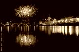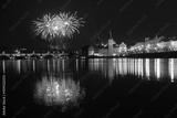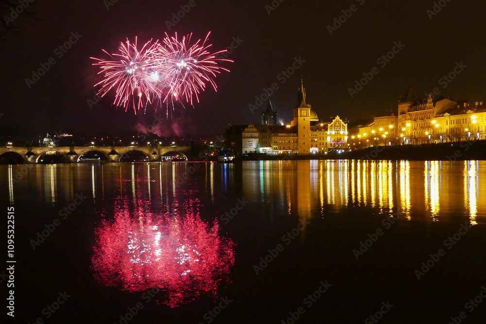 New Year's colorful fireworks with reflection on the river surface, festive mood